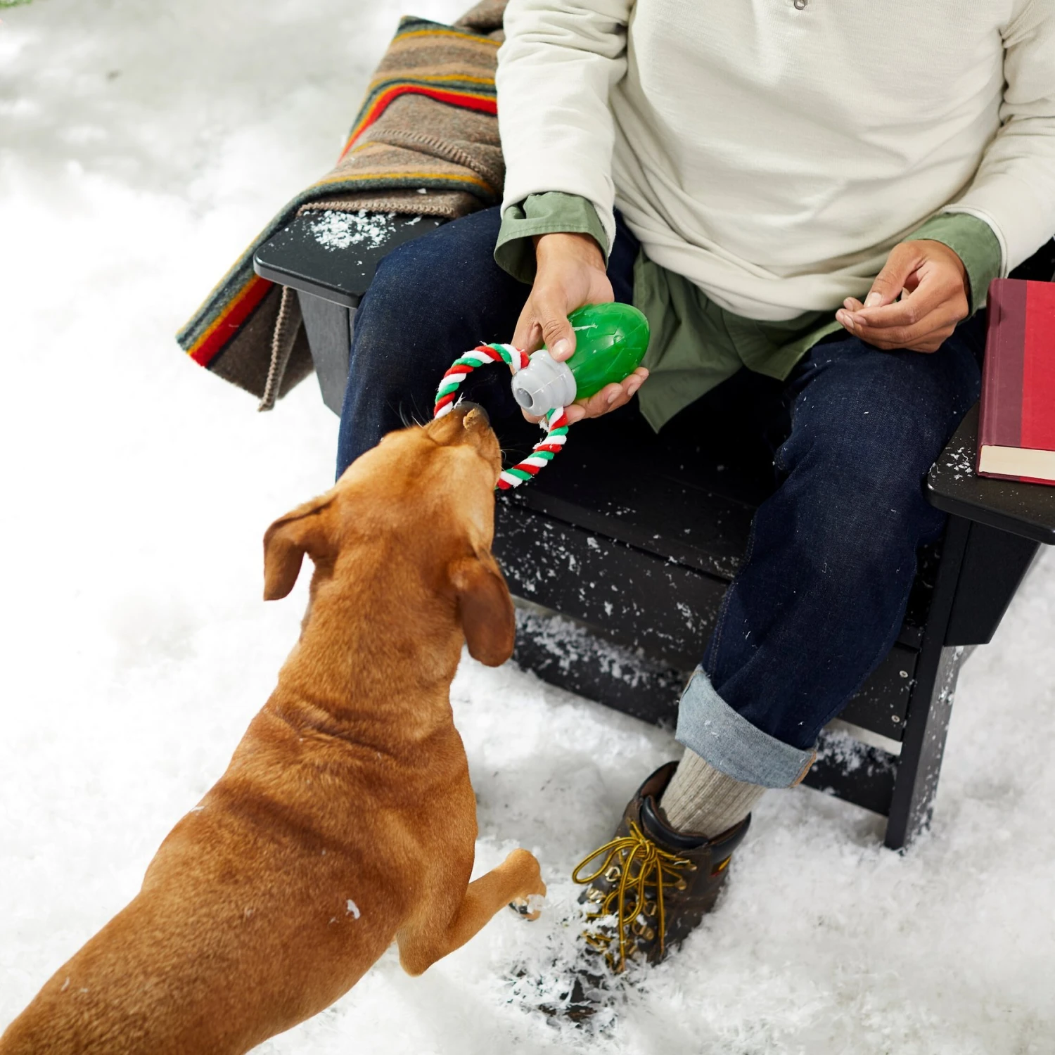 - Green TPR lightbulb toy includes a squeaker to keep your dog’s attention throughout the holiday season and beyond.